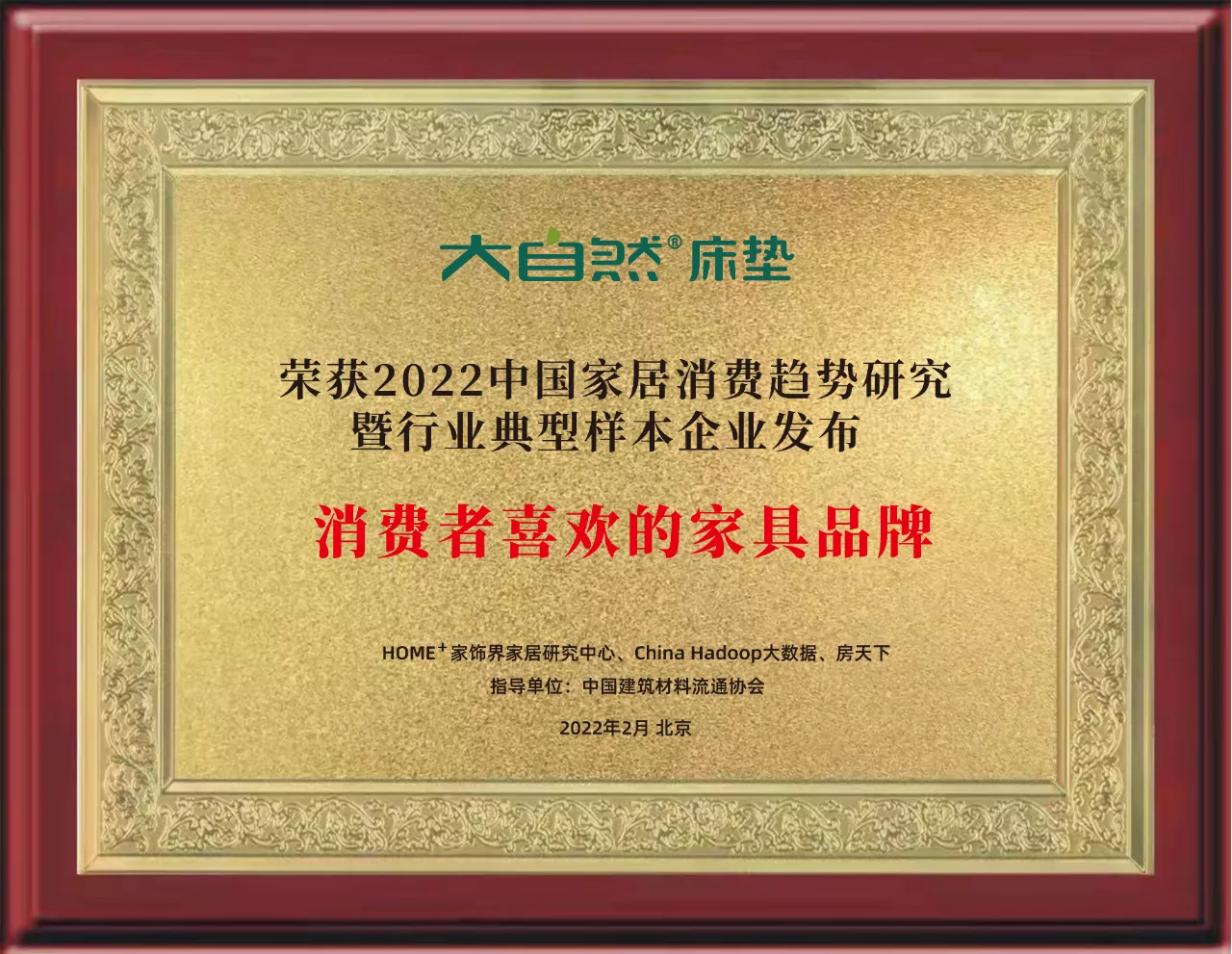 近日,由中國(guó)建筑材料流通協(xié)會(huì)指導(dǎo),HOME家飾界、China Hadoop大數(shù)據(jù)、房天下聯(lián)合主辦的“2022中國(guó)家居消費(fèi)趨勢(shì)研究暨行業(yè)典型樣本企業(yè)發(fā)布”成果在京發(fā)布,大自然床墊憑借消費(fèi)者的喜愛(ài),以超燃的品牌熱度及行業(yè)影響力入選“家具行業(yè)典型樣本企業(yè)”,并獲得“2022消費(fèi)者喜歡的家具品牌”稱號(hào)。