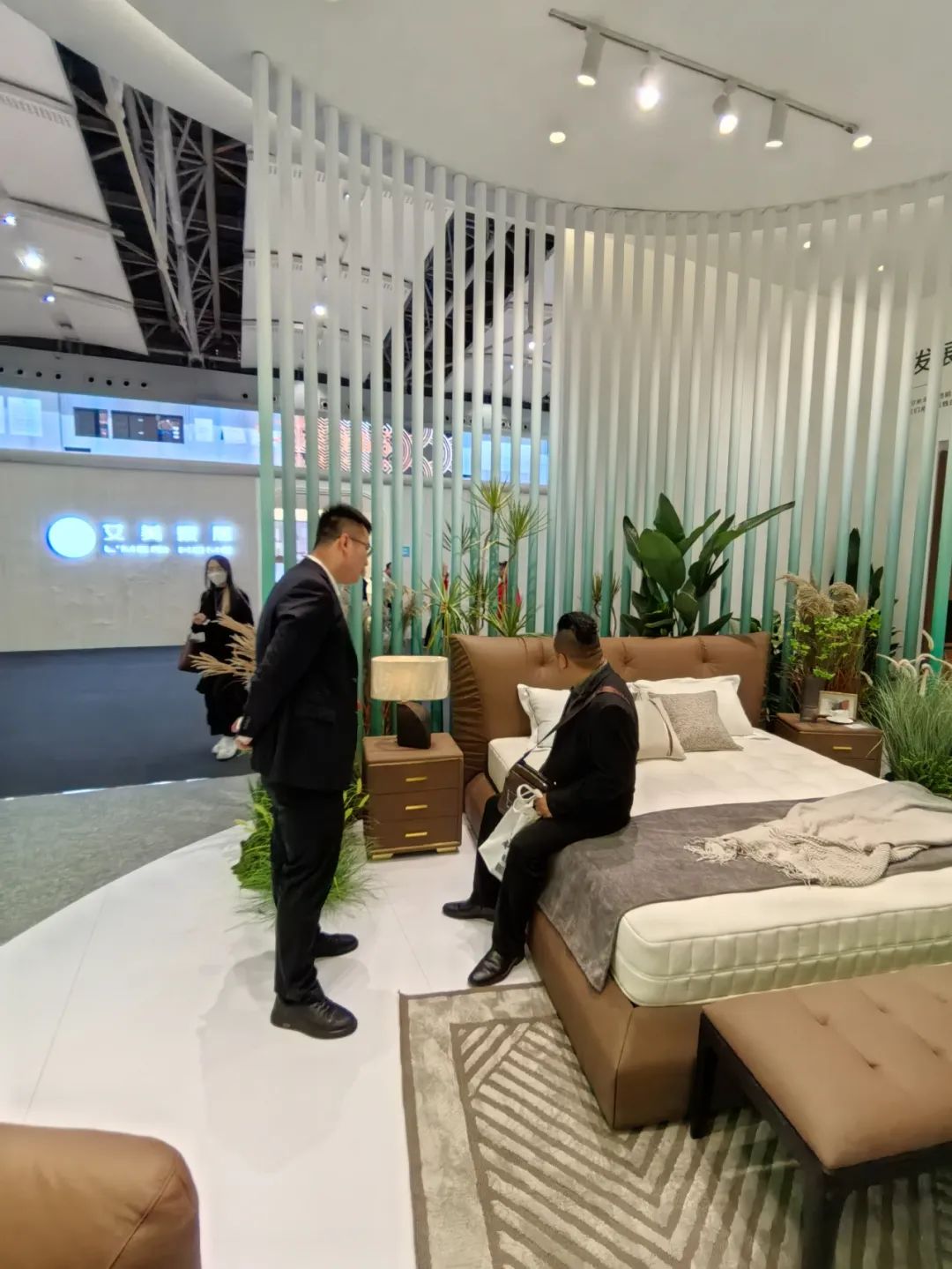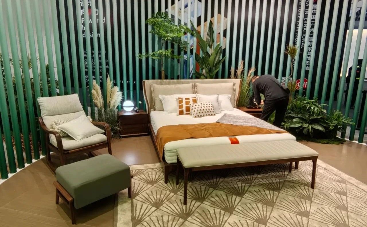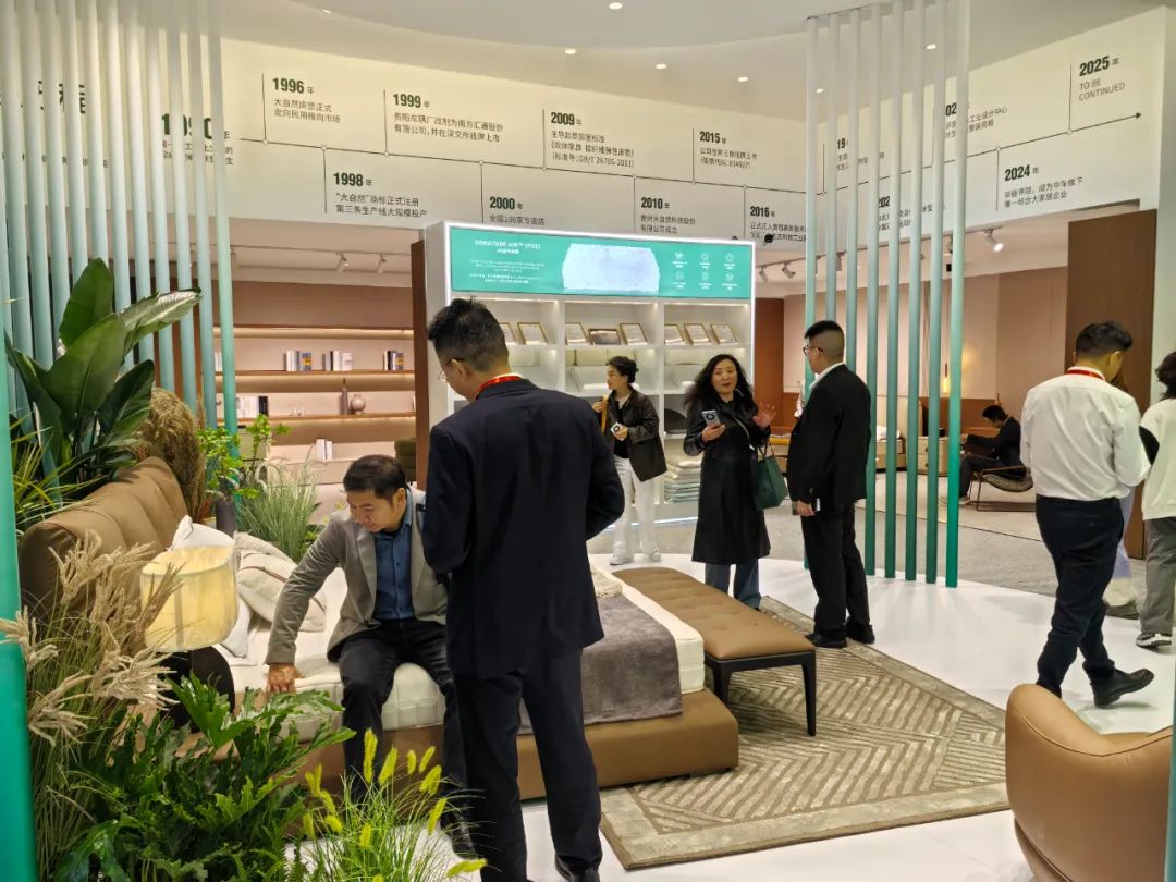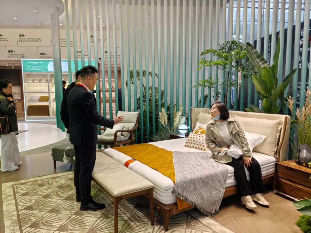 展會(huì)開展首日,琶洲展館內(nèi)人流如織,來自全球的經(jīng)銷商、設(shè)計(jì)師及消費(fèi)者齊聚一堂。大自然床墊以“生態(tài)生活”為設(shè)計(jì)理念打造的沉浸式主題展館成為全場(chǎng)焦點(diǎn)。展區(qū)通過天然棕床墊、生態(tài)整家定制與生態(tài)原木家具的結(jié)合,模擬出臥室、客廳等居家場(chǎng)景,吸引眾多觀眾駐足體驗(yàn)。